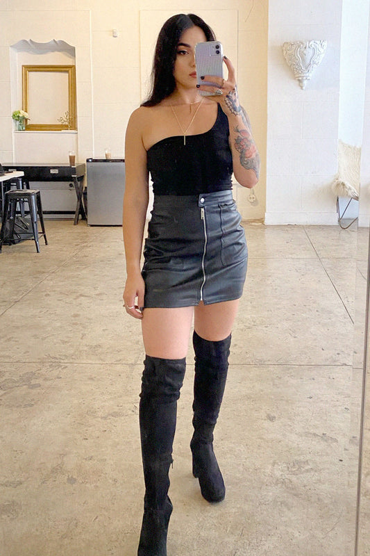 CHELSIE FRINGE LEATHER MINI SKIRT W/ STUDS