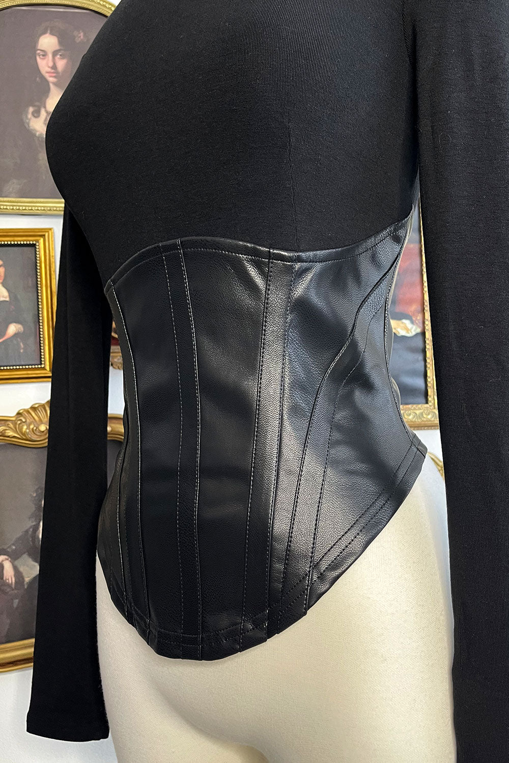 The Megan Long Sleeve Top blends edgy style with comfort. Featuring a mock neck and full-length sleeves, it offers a sleek silhouette enhanced by faux boning details and a back zipper closure for easy wear. Its stretchy fabric ensures a flexible fit, while the faux leather contrast adds a bold, alternative touch to your wardrobe.